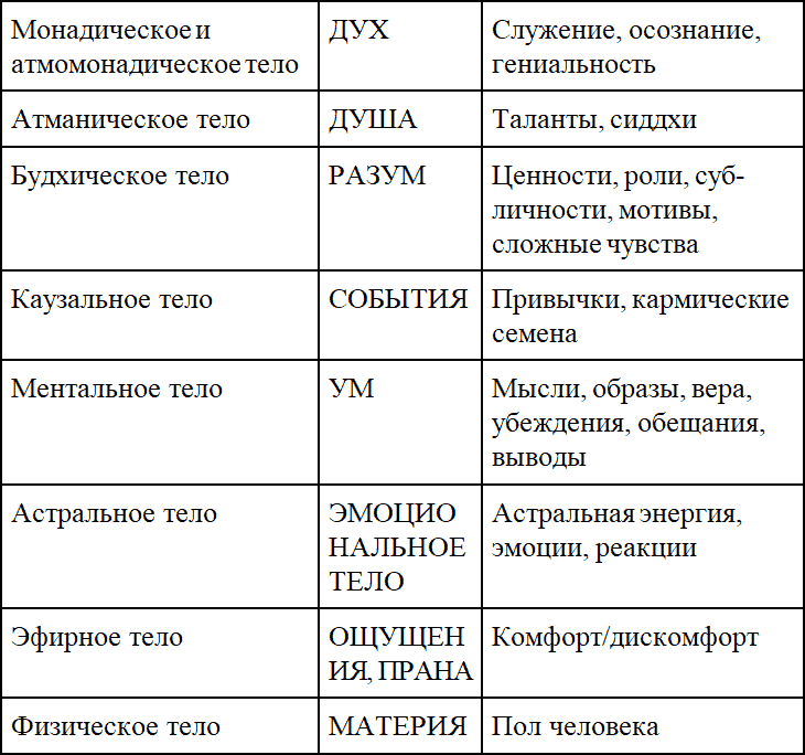 Каждое тонкое тело – это отдельное измерение человеческой психики. Ментальное тело – четвёртое тело, и оно ещё более-менее доступно для восприятия умом. Но так как органы чувств человека настроены на восприятие физической Вселенной, то следующие тонкие тела не воспринимаются органами чувств и умом. Тем не менее, они не только существуют, но и, как вы убедитесь сами, являются неотъемлемой частью нашего восприятия.