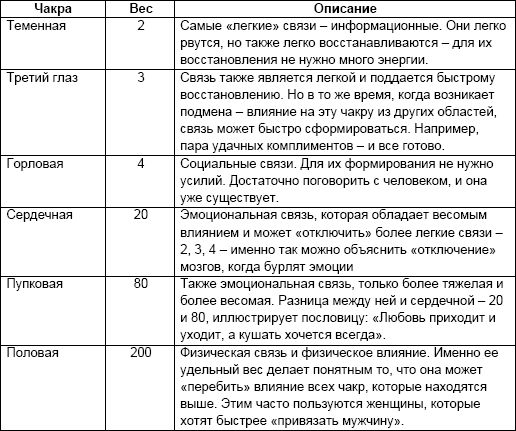 У каждой связи, равно как и у каждой чакры, есть понятие удельного веса. Это понятие условное. Оно характеризует силу и крепость взаимодействий. Чем «тяжелее» связь, тем она крепче и тем сложнее ее разрушить как извне, так и изнутри.