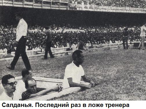 Впрочем, посудите сами. О том, что центральный нападающий из команды «Атлетико» Дарио, игрок таранного типа, является кумиром президента республики, в Бразилии знают все. И когда Салданье в пору его руководства сборной намекнули, что неплохо бы лайти в ней местечко для Дарио, он ответствовал, что, не претендуя на какую бы то ни было роль в формировании кабинета министров, определит состав своего «футбольного кабинета» без сторонней помощи и советов. Загало же на следующий день после своего прихода в сборную объявил об уточнении ее состава и в числе пяти вновь приглашенных игроков назвал, как и следовало ожидать, Дарио. После чего посадил президентского любимца (манера действий которого никак не согласовывалась с игрой Пеле, Тостао и Жаирзиньо) на скамейку запасных, где тот благополучно просидел в Мехико все матчи.