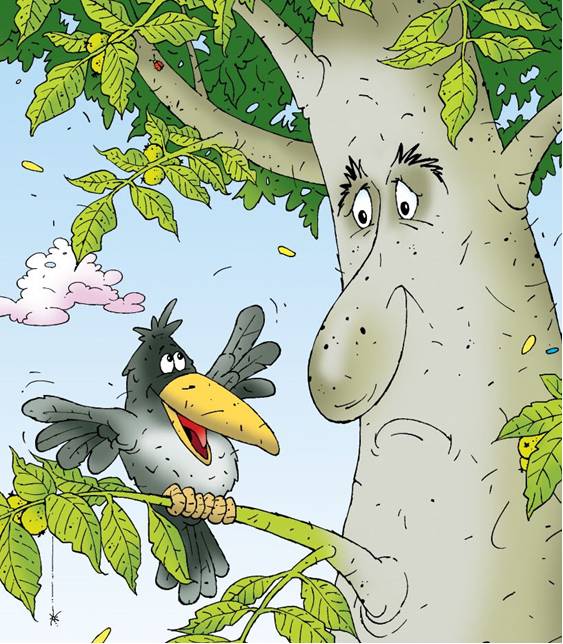 – Кра-ха-ха! – рассмеялась ворона, – да не внутр-ри, а снар-ружи! На ветках!