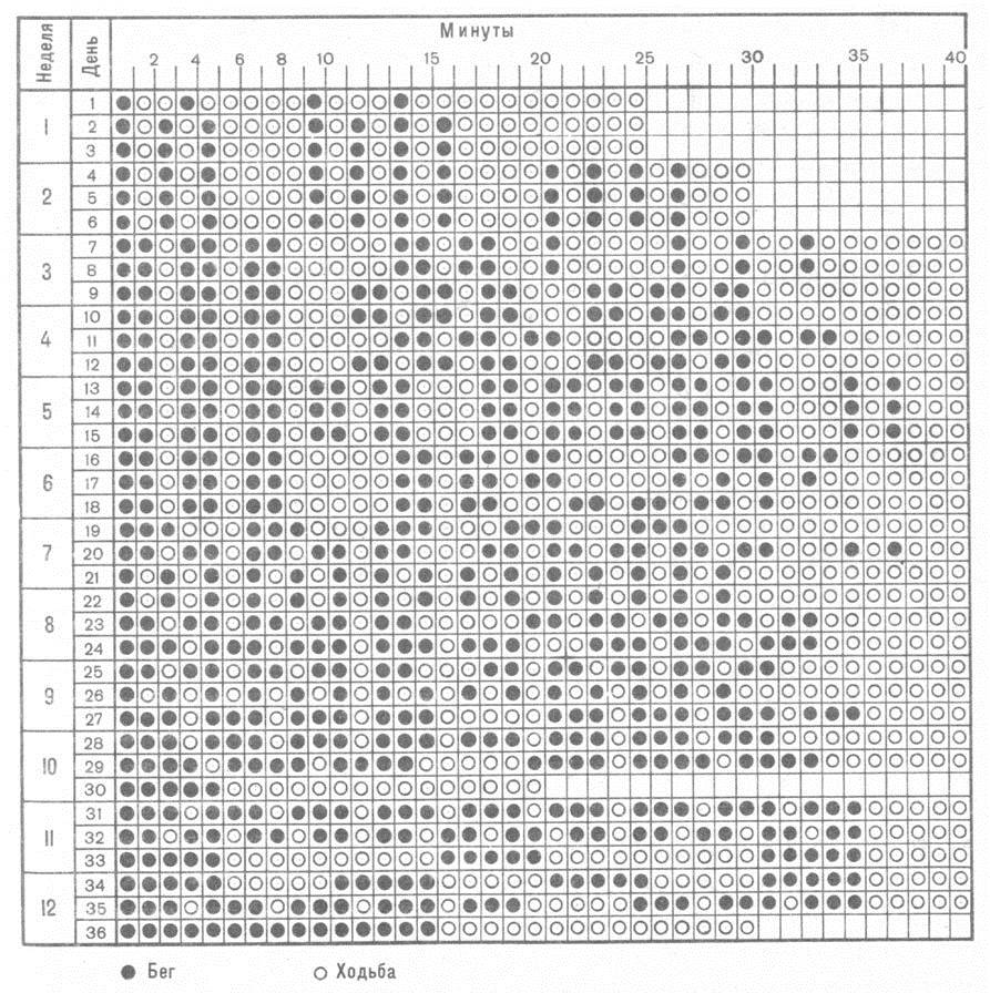 Однако попытки создания жестких по времени схем занятий нельзя признать удачными, так как при этом не соблюдается важнейший принцип тренировки — индивидуализация нагрузки. Отрезки ходьбы и бега не могут быть одинаковыми для всех. Подбираются они строго индивидуально таким образом, чтобы частота пульса не превышала оптимальных величин. В противном случае уменьшают отрезки бега и увеличивают продолжительность ходьбы до тех пор, пока частота пульса не снизится до нормального уровня. Увеличение отрезков бега и уменьшение интервалов ходьбы происходит естественным путем, по мере роста тренированности.