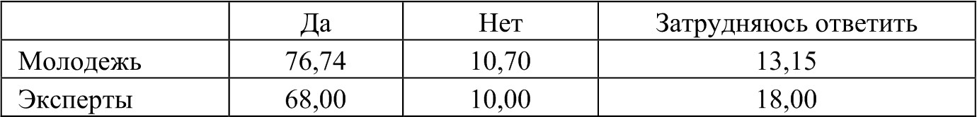Между тем сравнительные данные, приведенные в таблице 1, показывают, что мнения экспертов и самой молодежи относительно нецелеустремленной ее части совпали, а вот общую целеустремленность молодежи эксперты оценили почти на 13% ниже, чем сама молодежь. Кто прав в этом историческом споре поколений, покажет время, будущие свершения самой молодежи и мониторинг этой проблематики.