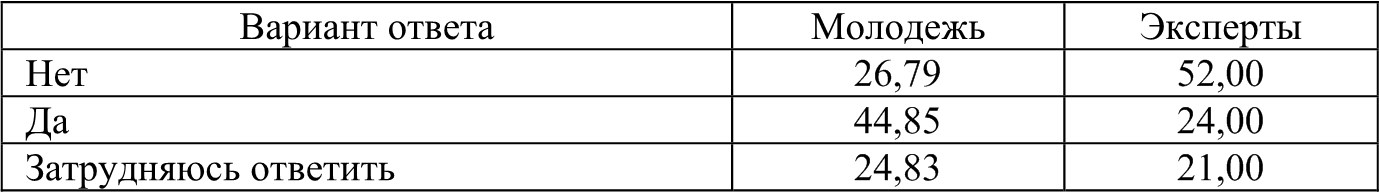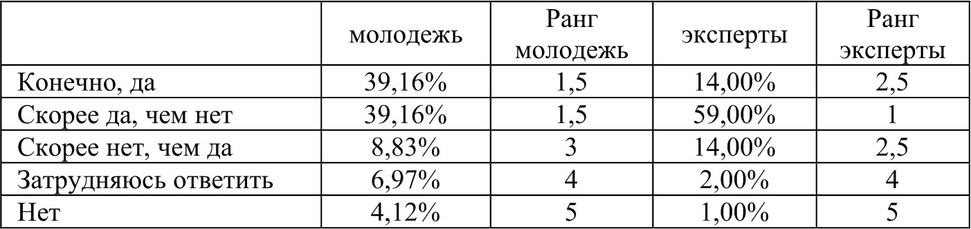 Общий итог тем не менее близок по значению. То есть мы можем считать, что молодежь и эксперты согласны с тем, что большинство молодежи все же являются патриотами своей страны.