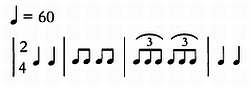 Дуоли и триоли обозначаются дугой поверх группы нот, под которой указывается число, соответствующее новому числу нот. Рассмотрим пример сложного ритма, в котором меняется темп и размер такта: