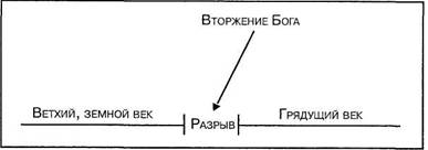 смертных, как они были прежде. И тогда начнется суд, возглавляемый Богом, и Он снова будет судить мир. Согрешившие нечестием будут погребены под землей, в просторах преисподней и в мерзких ямах геенны. Благочестивые же снова будут жить на земле, когда Бог даст им дух и жизнь и Свое благоволение. Тогда все они будут созерцать восхитительный и радостный свет солнца. О, сколь блажен тот, кто будет жить в это время» (4 Сивил. кн. 171-192).Итак, мир гибнет в огромном пожаре, сжигающем всю землю и уничтожающем все человечество. В одно мгновение перестают существовать все города, реки и даже моря. Нет ничего, кроме тлеющего пепла, и праха. Однако, когда все превращается в пепел, Бог прекращает пожар и воскрешает человечество, которое потом предстает перед великим и последним судом. Бог отделяет благочестивых от нечестивцев. Нечестивые погребены под землей, в то время как праведники продолжают жить в возрожденном раю.Прерывность между нынешним, ветхим веком и веком грядущим можно проиллюстрировать следующим образом: