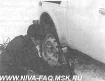 передней подвески, поперечина ее или коробки передач. В задней части — редуктор заднего моста и кронштейны крепления амортизаторов.В любом случае контакт надо исключить. Если машина застряла в песке или снегу, то можно попытаться откопать все указанные места. Если же "Нива" провалилась в глубокую колею, густую грязь и т. п., то лучше ее поднять. Сделать это можно с помощью штатного домкрата, поочередно поднимая каждое колесо и подкладывая под него подручный материал — камни, ветки, доски. Поднимайте машину до полного устранения контакта с грунтом. При этом домкрат лучше располагать наклонно, задвинув его опорную площадку под машину поглубже. В противном случае при поднятии "Нивы" вы рискуете поцарапать или даже помять боковину кузова верхней частью домкрата (осью рукоятки). Не забудьте подложить под опорную площадку домкрата несколько веток крест — накрест или пару дощечек, чтобы он не проваливался в грунт.