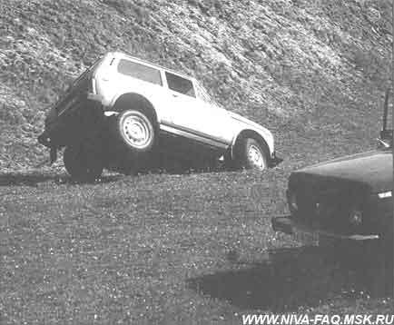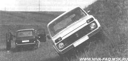 Для того, чтобы избежать раскачивания автомобиля и динамических увеличений крена, двигайтесь с минимально возможной скоростью. Для этого заранее включите нижний ряд в раздаточной коробке, первую передачу в коробке передач и двигайтесь как можно медленнее. Чем круче склон и больше на нем неровностей, тем медленней и аккуратней надо двигаться. И, конечно, старайтесь ставить автомобиль на склоне как можно круче, то есть ближе к кратчайшей линии ската. В случае сползания или опасного увеличения крена быстро направляйте "Ниву" вниз и добавляйте газ.