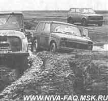 При движении по разбитой дороге (колеи, ямы и т. д.) дифференциал лучше заблокировать, так как появляется возможность значительной разгрузки одного из колес, что может привести к буксованию и снижению тягового усилия. При движении в колеях используйте рекомендации, приведенные в разделе "Колеи, канавы и "гребни". Как только почувствуете, что "Нива" "не тянет" на второй передаче и надо включать первую, остановитесь (в таком месте, где сможете тронуться) и перейдите на нижний ряд РК, оставив в КП вторую передачу. Это позволит в случае ухудшения условий движения, перейти на первую (пониженную) передачу без остановки, К тому же теперь у вас в распоряжении три (1, 2 и 3) передачи ниже второй повышенной.