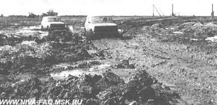 Второй способ — "динамический" или "нивовский", с использованием запаса кинетической энергии движущегося автомобили. Он больше подходит для карбюраторных "Нив" — 2121 и 21213. Также он применим и на "впрысковой" машине 21214, а вот на дизеле пользоваться этим способом не стоит. Интересен этот способ продвижения еще и тем, что почти "уравнивает" шины ВлИ-5 и ВлИ-10 (за исключением возможности выезда из колеи). Особенность этого способа — движение с определенным запасом скорости. Это позволяет "пробивать" сложные участки.