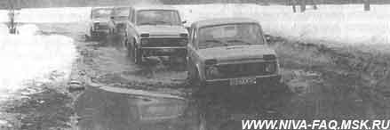 Техника ''пилотирования" такова: тронувшись, плавно набираем обороты двигателя, пока не почувствуем интенсивную пробуксовку колес. Ее наступление контролируется по взревевшему мотору. Затем начинаем плавно приотпускать педаль акселератора до тех пор, пока не почувствуем, что колеса перестали проскальзывать и начинали цепляться за грунт и "Нива" получает хоть какое-то ускорение. Фиксируем ногу в голеностопе на несколько секунд, затем снова начинаем плавно нажимать на педаль акселератора, пока вновь не почувствуем явную пробуксовку колес и потерю скорости. И опять все начинаем сначала. Таким образом, все время контролируется пробуксовка колес и постоянно "прощупывается" коэффициент сцепления.