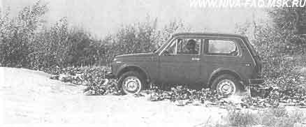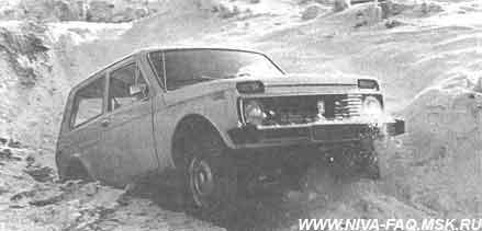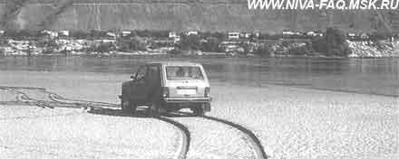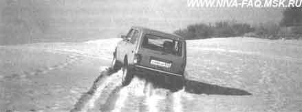 на сыпучем песке очень плавно, с большим радиусом. Если необходимо остановится, это лучше сделать на спуске, влажном песке или островках растительности. Трогайтесь на первой, естественно, при пониженной передаче РК при минимальных оборотах, очень плавно отпуская педаль сцепления. Если "Нива" движется уверенно, можно включить вторую передачу, но дальше этого на сухом песке заходить не стоит. Не включайте верхнюю передачу раздаточной коробки даже на сыром, плотном песке, так как при внезапном ухудшении дорожных условий и нехватки крутящего момента вам придется полностью останавливать автомобиль для включения пониженной передачи.Если пробуксовки избежать не удалось, и колеса зарылись в песок, не буксуйте, так как это приведет к дальнейшему самозакапыванию автомобиля. Лучше попробуйте расчистить песок перед всеми колесами.