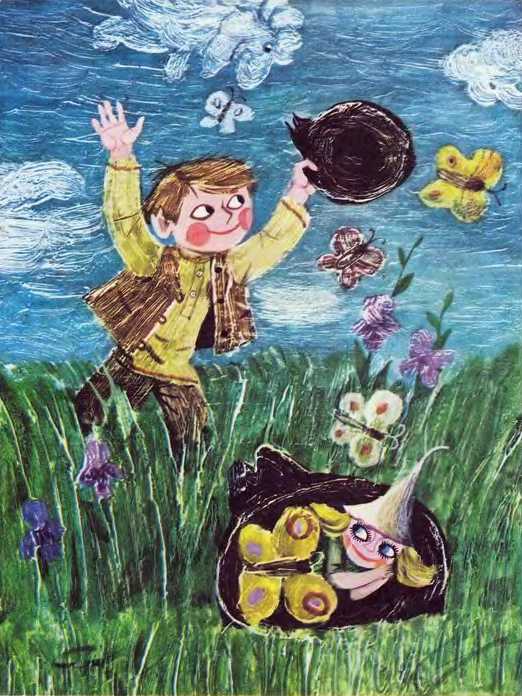 Он выбежал во двор и увидел, что Гиочика по-прежнему спит в шляпе, а вместо одеяла её накрыли две бабочки.