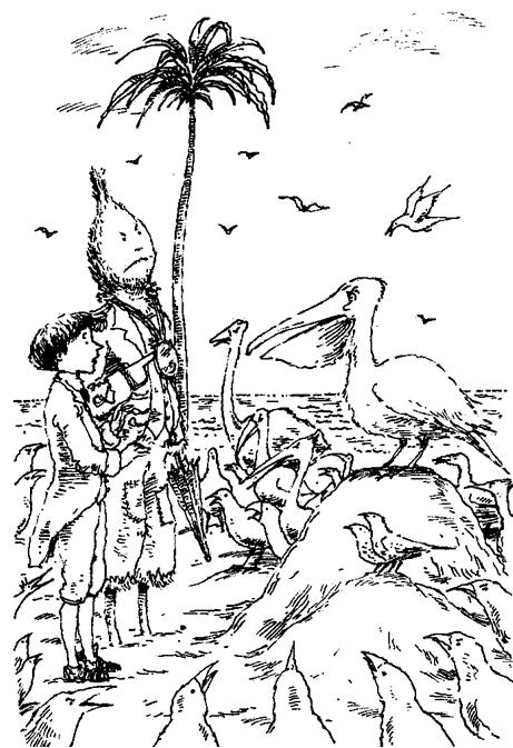 — Вот видите. Об этом я и говорю, — сказал Джек, пробираясь сквозь ряды птиц. — Мистер Президент, совершенно очевидно, что вы и сэр Чучело говорите на разных языках. Вы говорите на птичьем — древнем и благородном наречии, достойном того смелого народа пернатых героев, который им пользуется. А сэр Чучело говорит на языке кокосовом — сложном и загадочном, полном глубокой мудрости и внутренней музыки. Так что, если позволите, я мог бы переводить…
