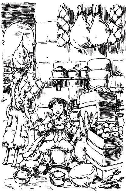 С потолка свисали копчёные окорока и связки лука, а на полу лежали сырные головы размером с колесо от телеги, коробки с яблоками, всевозможные пироги, хлеб, печенье, пирожные с заварным кремом, имбирные пряники, фруктовые пряники, медовые — всё, что душе угодно.