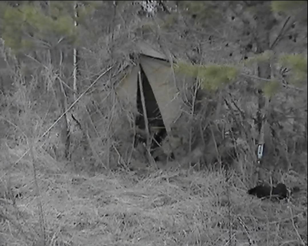 Я решил снимать с приличного расстояния, чтобы не пугать птиц, тем более что камера даёт возможность приблизить объект съёмки. Метрах в 25 от центра тока, то есть от стола, в молодых сосенках я просто поставил палатку, но поставил особым манером, можно сказать, в укороченном виде. Палатка моя стояла на одном флагштоке – на переднем. Задняя часть её просто валялась на земле (палатки были ещё старорежимные). Конечно, места в такой палатке было маловато, но в общем расположился я неплохо. Укрытие своё замаскировал сосновыми ветками и стеблями сухой полыни, которая росла тут же, на дороге, и местами образовывала густые непроходимые заросли. Устроился я на пригорке, и обзор для съёмки был просто великолепный. Я нашёл место для съёмки, о котором можно было только мечтать. Погода благоприятствовала: была тихая, безветренная, с морозцем – то, что мне надо.