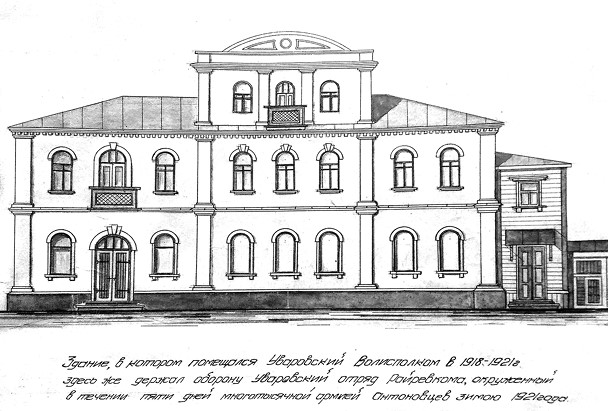 Воспоминания А. Пашкова «Пять дней, пять ночей» // Альбом «Уварово в период Гражданской войны 1919–1921 годы. Книга-альбом, посвященная 50-летию окончания Гражданской войны» (1971). Л. 1. Здание волисполкома (см. ил. 1), в прошлом – особняк помещика Некрасова, размещалось в центре Уварова, до наших дней не сохранилось.
