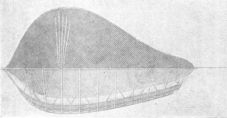 В качестве одного из орудий борьбы с нашествием полчищ Наполеона русское правительство решило использовать спроектированный механиком Леппихом в Вюртемберге управляемый аэростат. После постройки и испытания головного корабля намечалась постройка целой эскадры таких воздушных кораблей, чтобы поражать наполеоновские войска с воздуха. Первая «дирижабельная верфь» была устроена в селе Воронцове, под Москвой. По сохранившимся архивным и литературным данным [29] , дирижабль имел матерчатую оболочку хорошо обтекаемой каплевидной формы. По ее экваториальному поясу подвешена была длинная гондола, и на той же высоте, ближе к носовой части, крепились опорные шарниры пропеллирующих крыльев на манер плавников у рыб. Они должны были приводиться в действие мускульной силой людей, помещавшихся в гондоле. Мы знаем, что для того времени убеждение в возможности применения мускульного двигателя для воздухоплавания было очень типичным.