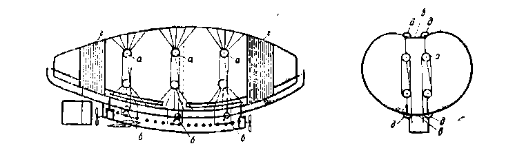 Схема цельнометаллического дирижабля Циолковского в продольном и поперечном разрезах.