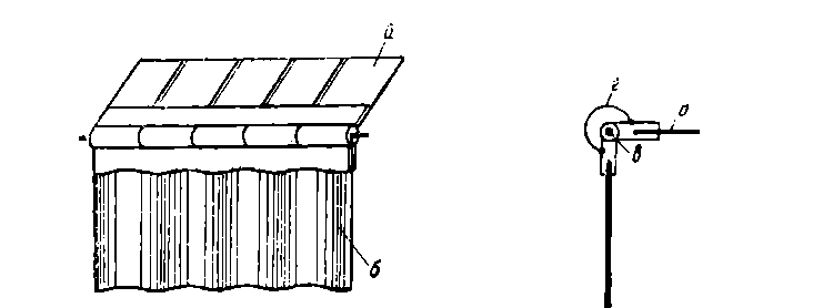 а) блоки, б) лебедка стягивающей системы, В) и в) верхнее и нижнее основания оболочки, г) боковины оболочки из гофрированного листового металла, д) колпаки, прикрывающие шарнирные соединения.