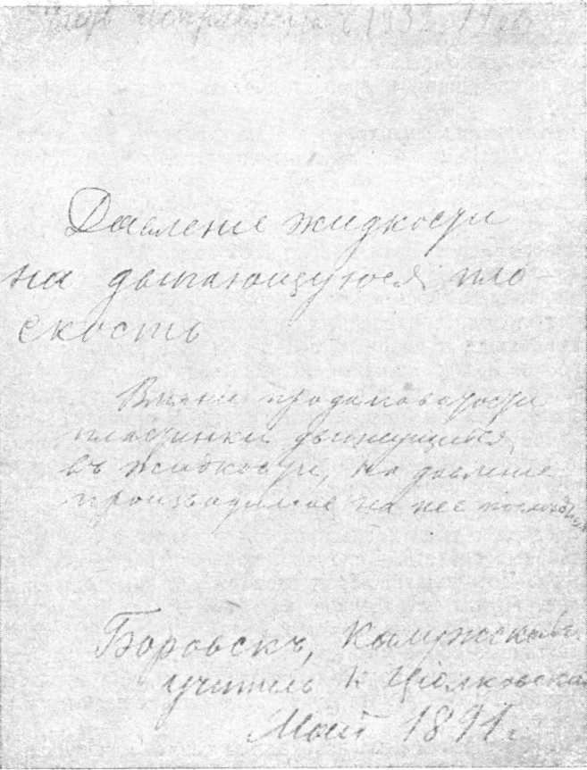 сталкивала громоздкое сооружение с мели.Факсимиле титульного листа рукописи К. Э. Циолковского «Давление жидкости на двигающуюся плоскость» (1891).
