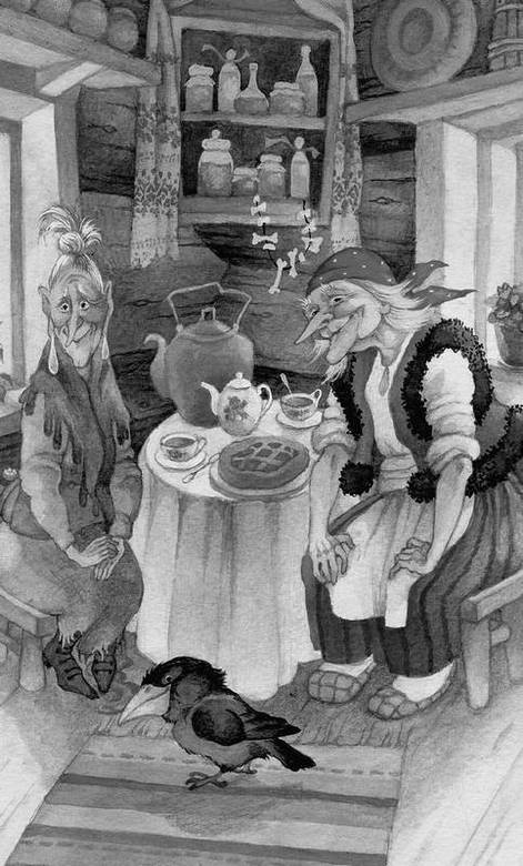 В доме было чисто и прохладно. Баба Яга, с большим носом, нарядная и причёсанная, сидела за столом, а рядом с ней – маленькая, затхлая и какая-то вся зелёная незнакомая старушка.