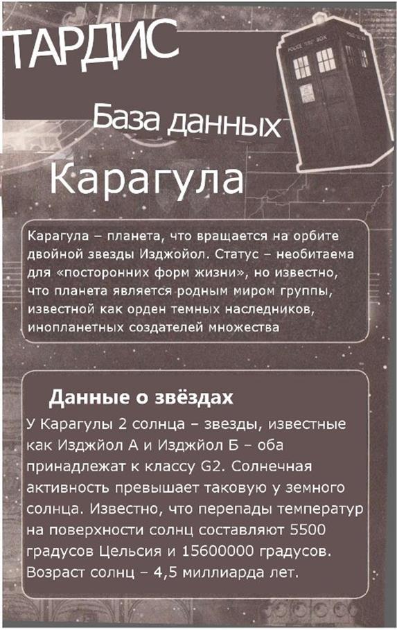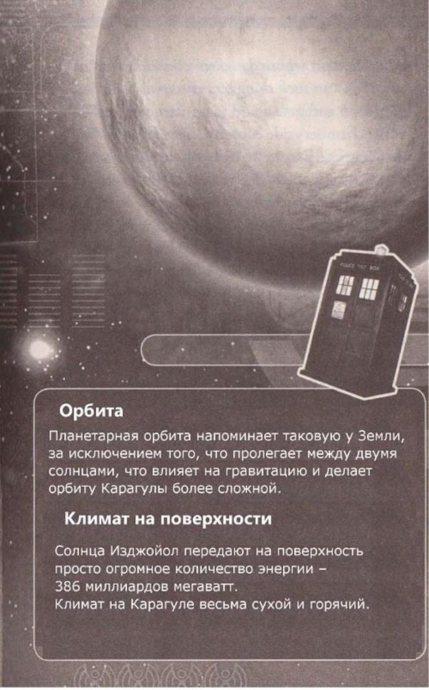 Доктор сглотнул. Во вселенной было не так много мест, что пугали его, но Карагула, дом темных наследников, было одним из них. Даже в полной силе повелители времени не рисковали бывать у Карагулы. А теперь он остался один и столкнется с темными наследниками в одиночку. С мрачным видом Доктор ввел координаты в навигационные системы ТАРДИС. Насос, пространственные цепи, рычаг дематериализации, и временной корабль начал свое движение.