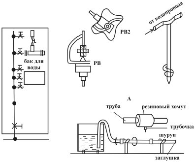На рис. 7 показаны схемы разбрызгивателя воды типа РВ-1 и распылителя воды РВ. Для почвенного полива деревьев используют различные виды гидробуров. Но наиболее экономичен капельный полив. Дождевальный полив как наиболее красивый можно применять для полива лужаек и цветников.