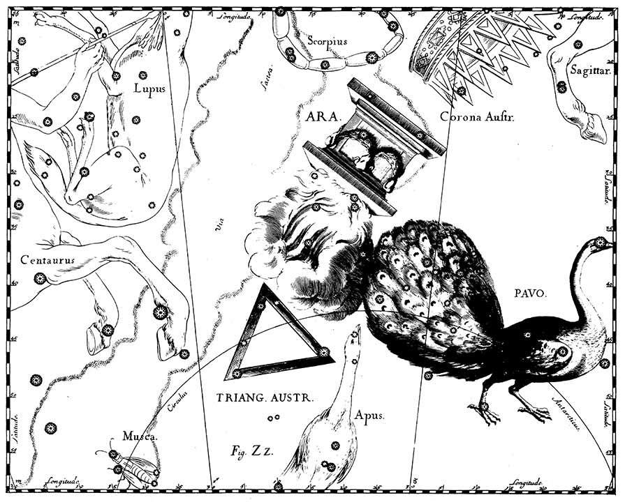 А. XIX. 1 Созвездие Жертвенник (ARA) из Атласа «Uranographia» Яна Гевелия 1690 года.