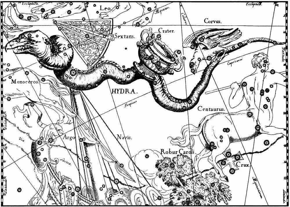 А. XXI. 1 Созвездие Гидра (HYDRA = Водяная Змея) и связанные с ней созвездие Ворон (Corvus) и созвездие Чаша (Crater) из Атласа «Uranographia» Яна Гевелия 1690 года.
