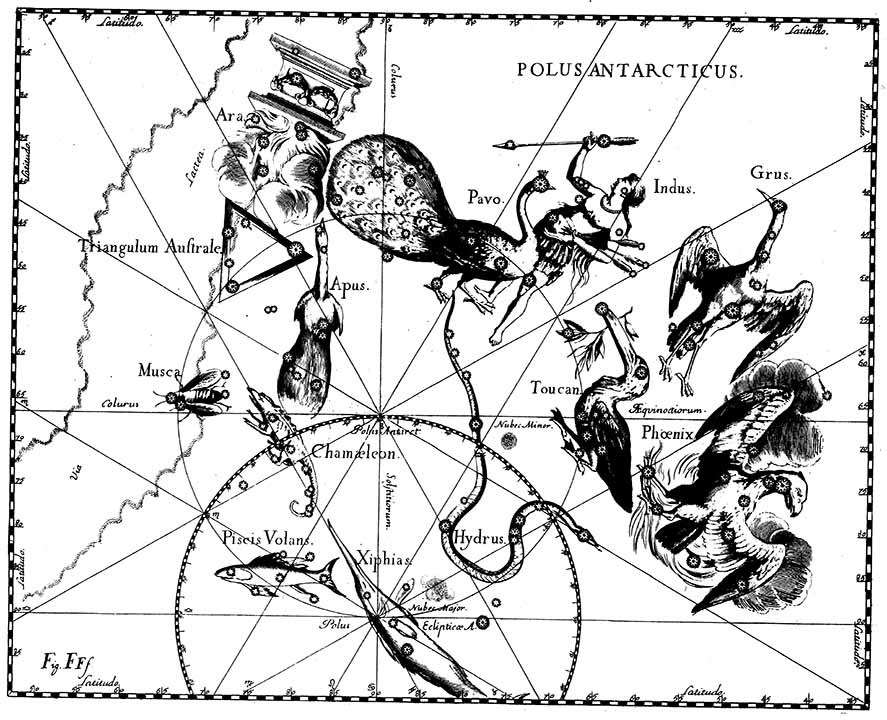 По порядку слева направо сверху вниз: созвездие Жертвенник (Ara), горящий в перевёрнутом виде; созвездие Павлин (Pavo) с пышным хвостом; созвездие Индеец (Indus) со стрелами в руках, но без лука; созвездие Журавль (Grus); созвездие Южный Треугольник (Triangulum Australes); созвездие Райская Птица (Apus); созвездие Южная Муха (Musca); созвездие Хамелеон (Chameleon); созвездие Тукан (Toucan) с ветвью в клюве; созвездие Феникс (Phoenix), возрождающийся из дыма и пепла; созвездие Летучая Рыба (Piscis Volans); созвездие Золотая Рыба (Xiphias); созвездие Южная Змея (Hydrus) или Южная Гидра.