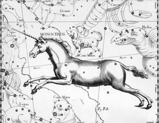 Вверху Зодиакальное созвездие Близнецы (Gemini) и Зодиакальное созвездие Рак (Cancer). Над Единорогом созвездие Малый Пёс (Canis Minor). Слева созвездие Орион (Orion), с огромным Мечом на Поясе и Дубиной в руке, под ним созвездие Заяц (Lepus). Внизу созвездие Большой Пёс (Canis Major). Справа созвездие Гидра (Hydra).