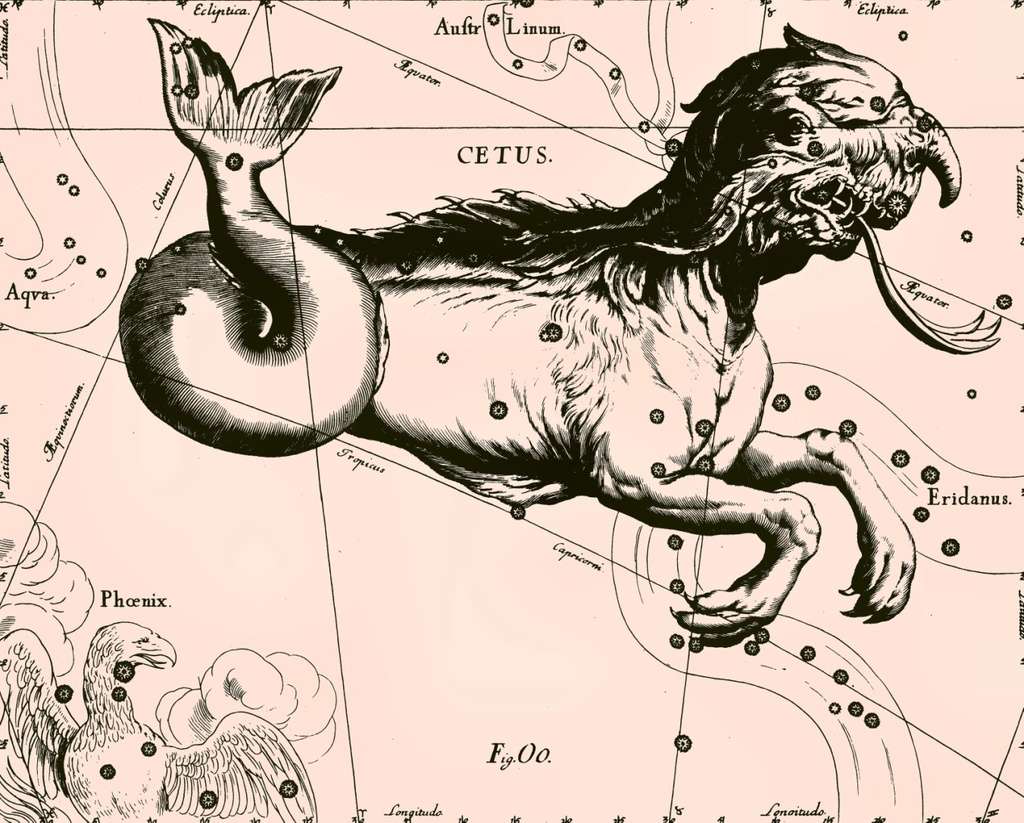 Слева созвездие Вода (Aqva), вытекающая из Кувшина созвездия Водолей. Сверху Линь Южный (Austr Linum) из созвездия Рыбы. Внизу слева созвездие Феникс (Phoenix), исчезающее в дыму и возрождающееся. Под ногами Кита созвездие Эридан (Eridanus).