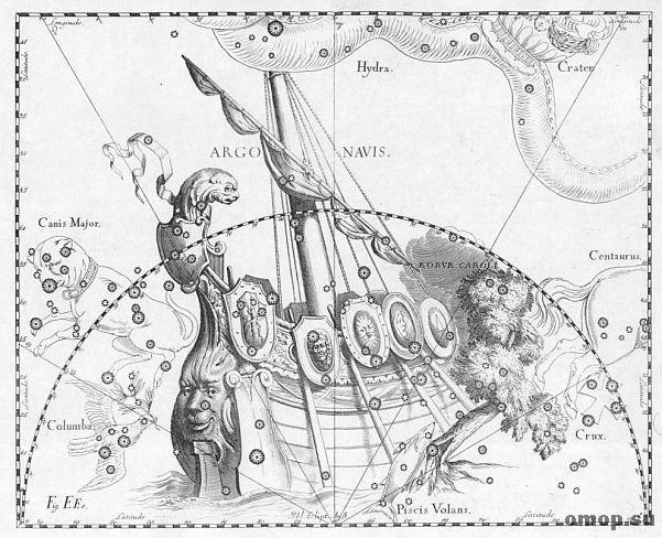 А. XVIII. 4 Созвездие Корабль Арго (ARGO NAVIS) или Ноев Ковчег из Атласа «Uranographia» Яна Гевелия 1690 года.