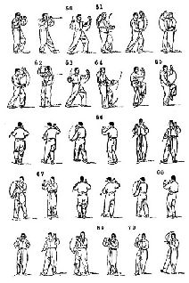 Боевое применение требует большого практического опыта. Сначала надо изучить две различные последовательности из 44 позиций каждая, расписанных для партнеров А и В. Порядок позиций подобран так, что каждая позиция А может быть отражена позицией В. Когда последовательность изучена, два партнера могут начинать текучий спарринг тайцзи. Действие А вызывает ответ В, а то – новое действие А и т. д., пока не будут пройдены все 44 позиции каждого из партнеров. Спарринг (тайцзи-саньшоу) из 88 позиций настолько изощрен и эффективен, что остается только преклоняться перед интеллектом его создателей из рода Ян.