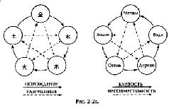 Циклы, включающие четыре принципа взаимности, даны в виде диаграмм на рис. 2-2а. Сходства и различия между принципами можно анализировать в терминах Инь и Ян. Порождение и близость, конструктивные принципы, -это Ян. Разрушение и несовместимость, их противоположности, -это Инь.