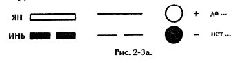 Ян часто изображают графически в виде отрезка прямой или белого кружка. Инь обычно представляют в виде двух черточек с промежутком между ними или черного кружка. Различные символы Инь и Ян показаны на рис. 2-За.