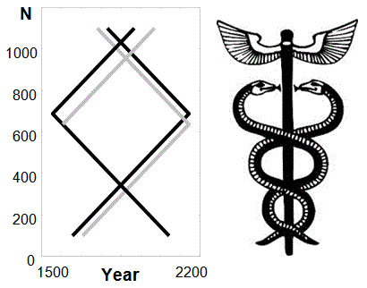 здесь N — число образуемое из номера центурии и катрена, P — интервал времени, на который рассчитывались пророчества, X — начальная точка (1555 или 1606 год). Собственно, сама идея датировать катрены такими формулами была навеяна приведенным выше построением «магических жезлов». График построенный по формулам датировки ассоциируется с кадуцеем Гермеса.
