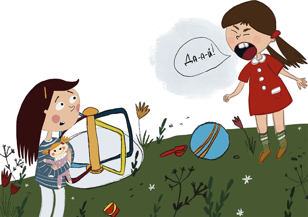 Девочка играет, куклу не дает. Тут Света и начинает губы надувать, ногами топать и на землю падать. Девочка посмотрит на нее и убежит в другое место играть. А Света на земле валяется, ждет пока бабушка прибежит. Бабушка услышит, дома все дела бросит