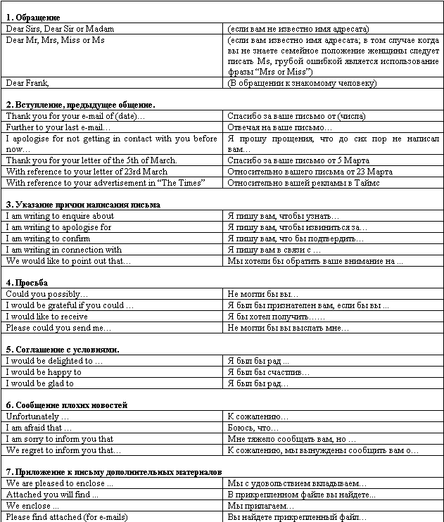 • Существуют стандартные выражения, часто употребляемые в деловой переписке на англиском языке, использование которых придаст вежливый и официальный тон вашему посланию (подробнее см. Шевчук Д.А. Английский язык: самоучитель).