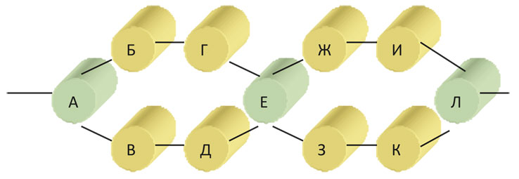 Это – сеть комбинированная, в сущности представляющая собой единство открытой «Змеи» и замкнутого «Колеса» или «Круга». Процесс коммуникаций имеет уже здесь свои тупики, а связники легко превращаются в контролеров. Эти тупики при необходимости можно преодолеть замыканием самой «змеи» с использованием принципа «соединительного звена».