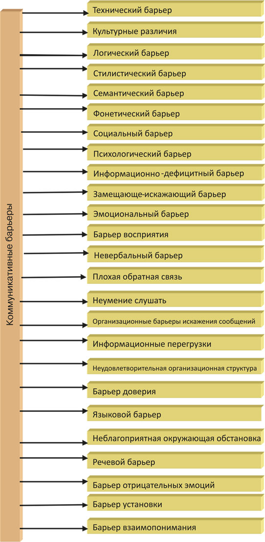 барьер, социальный, психологический, информационно-дефицитный барьер, эмоциональный барьер, барьер восприятия, невербальный барьер, плохая обратная связь, неумение слушать, организационные барьеры, информационные перегрузки, неудовлетворительная организационная структура, барьер доверия, языковой барьер, речевой барьер, барьер отрицательных эмоций, барьер установки, барьер взаимопонимания (рис. 3.1).Технический барьер – барьер в виде шумов и помех в искусственных коммуникационных каналах. Шумы имеют естественное происхождение, а помехи создаются умышленно. Причинами технических барьеров могут быть: технический сбой (поломка факсимильной машины), неправильная технология (сложное сообщение по телефону), неправильное использование (неправильный адрес электронной почты).