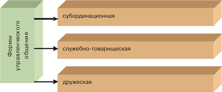 общения. Управленческое общение определяют как общение, вызванное необходимостью осуществления управленческих функций с учетом обратной связи. Управленческие отношения предполагают тесное взаимодействие между объектом управления и субъектом управления, осуществляющих сознательное воздействие на объект для достижения поставленных целей. Выделяют несколько форм управленческого общения: субординационная форма общения, служебно-товарищеская форма общения, дружеская форма общения. [26, с. 59] (рис. 1.9)Рис. 1.9. Формы управленческого общения