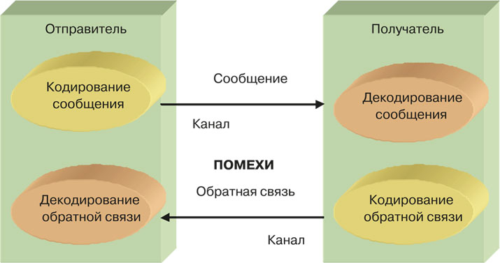 Коммуникативный процесс начинается с формулирования сообщения в мозгу отправителя. Затем оно кодируется, превращается в последовательность произносимых слов. Закодированное сообщение передается по выбранному каналу. Когда сообщение доходит до получателя, оно должно быть декодировано. Смысл, скрывающийся за словами, интерпретируется получателем и происходит восприятие сообщения мозгом. Обратная связь представляет собой, по сути, аналогичный коммуникативный процесс, только получатель послания превращается в отправителя.
