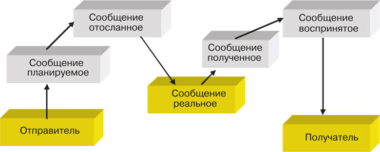 Сообщения подвержены воздействию шума и появлению ошибок при кодировании, в связи с этим сообщение которое планирует передать отправитель, не всегда совпадает с сообщением, которое воспринял получатель. Выделяют следующие типы сообщений: сообщение планируемое, сообщение отосланное, реальное сообщение, полученное сообщение, воспринятое сообщение (рис. 2.2).