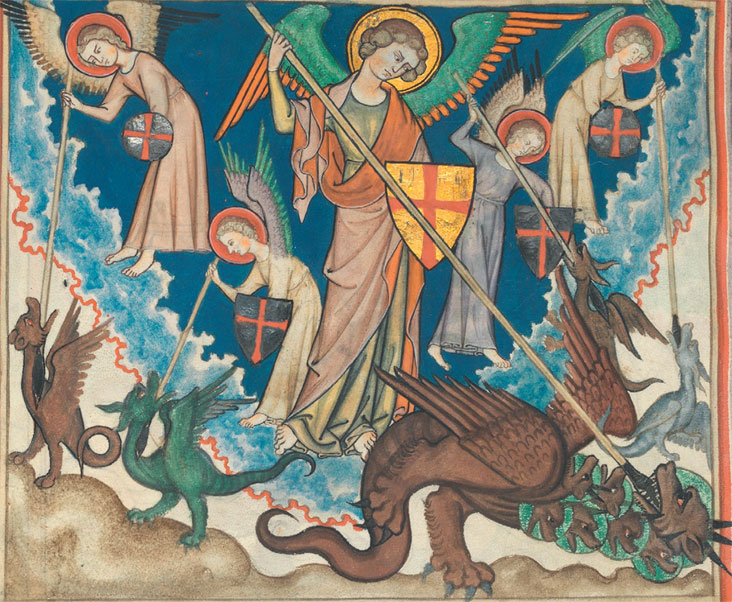 Война на небесах на миниатюре «Апокалипсис». Ок. 1330. Нью-Йорк, Метрополитен-музей