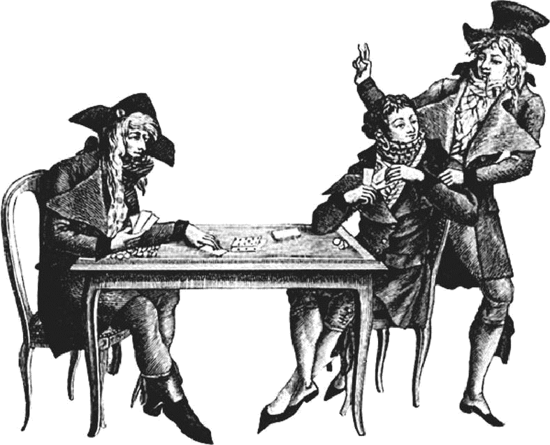 Три игрока за карточным столом. Увеличенные лацканы – характерная черта костюма инкройяблей. 1798 г.