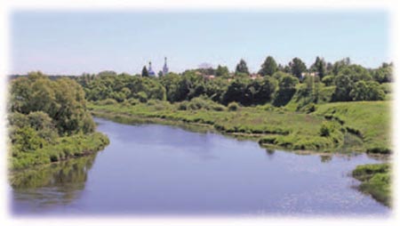 Над этой светлою рекой Под невысоким серым небом, Как страж Отчизны дорогой, Стоит Бориса храм и Глеба. Глядя на стен его седины, Представил я себе картины, Что эти светлые места Затмили век всего спустя: Еще в неведомых степях Клубится черная беда, Но скоро дикая Орда, Все обращая в тлен и прах, Нагрянет тучей и сюда, На земли Суздальского края, Его нещадно разоряя. И воды чистые Нерли, Отрады этих мест, Вдруг потемнеют от крови На много верст окрест. Но будет над рекой светится Крестом, воздетым к небесам, Седого времени страница, Посланец будущим векам — Нетленный православный храм!.. На том же правом берегу, Чуть ниже по теченью Другой белеет Божий храм В тиши уединенья. Он не так знаменит, Как описанный выше, Но путь сердцу открыт К каждой Господа «нише»Вид от Кидекши на р. Нерль, старинное село Новосёлка Нерльская и Воскресенский храм 1795 года