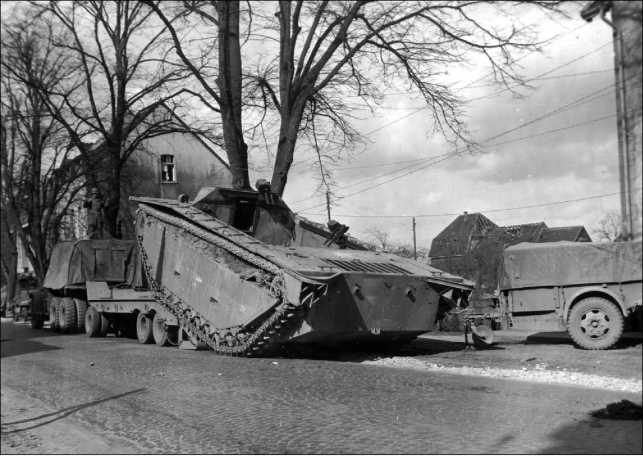 Плавающий транспортер LVT-2 («Буффало») выгружается с танкового транспортера у города Райнберг, район Безеля, Германия, 1945 г.