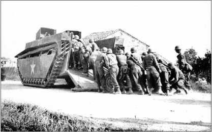 Солдаты 88-й пехотной дивизии США загружают 105-мм гаубицу М101 (М2А1) в плавающий транспортер LVT-4 для переправы через р. По. Впереди транспортера виден плавающий автомобиль DUKW.