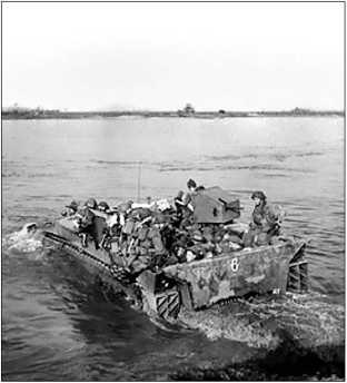 Плавающий бронетранспортер LVT-4 (Armored Cab) британской армии форсирует реку.